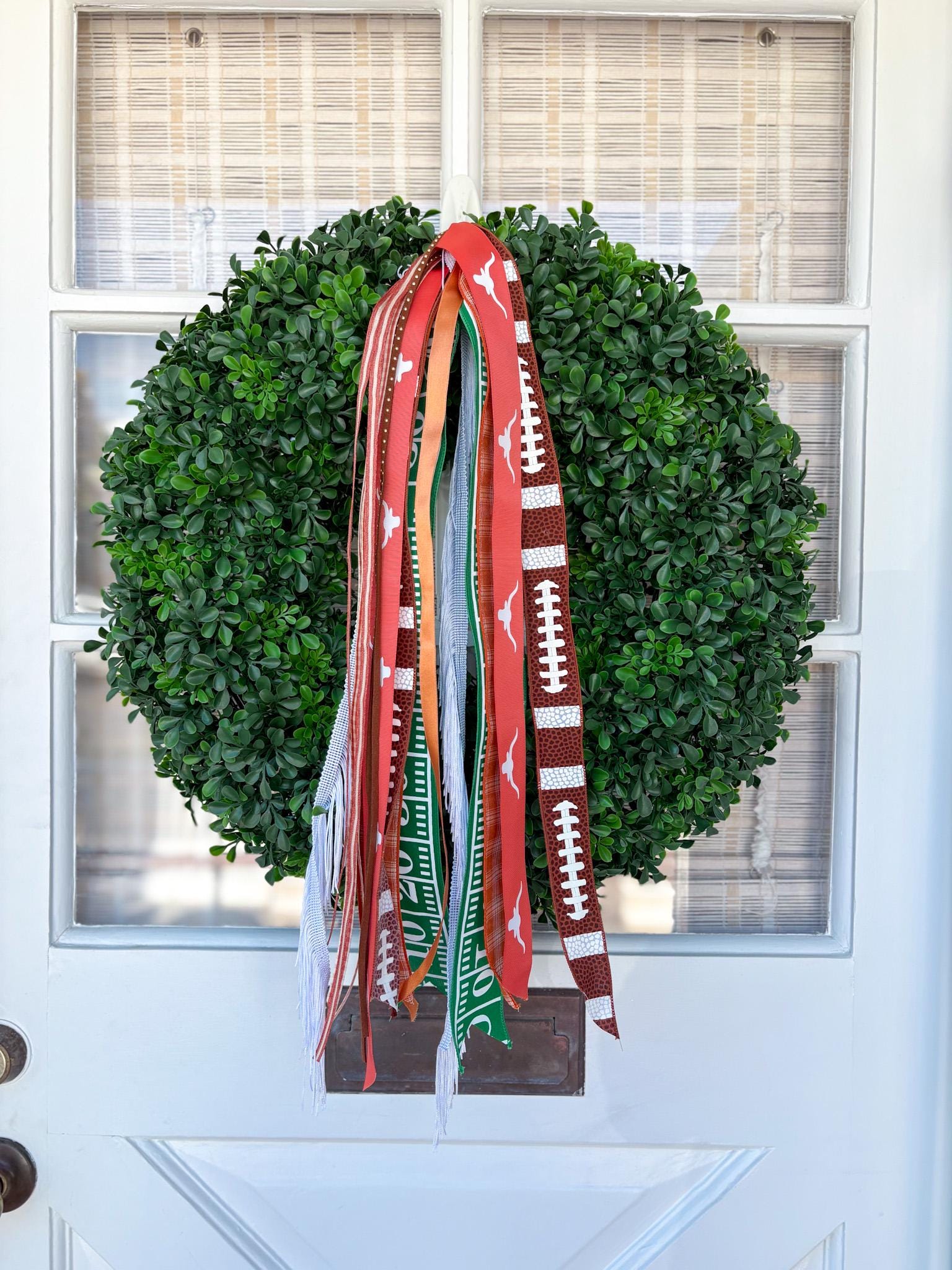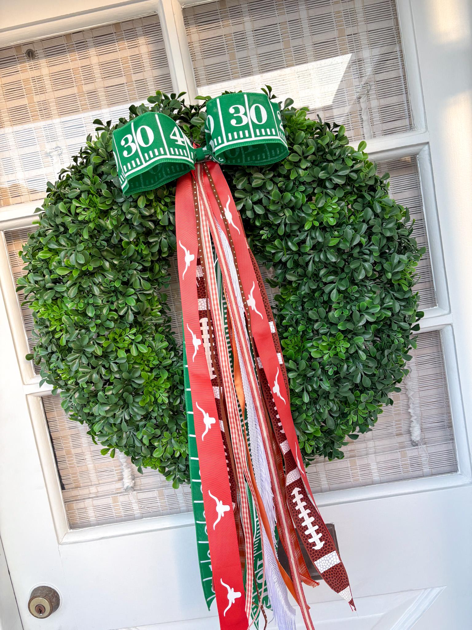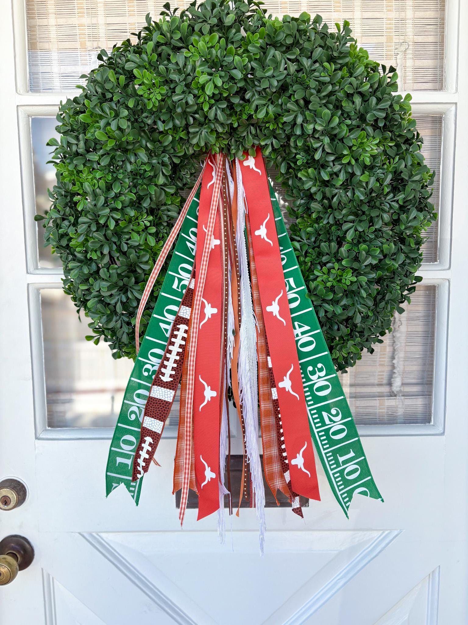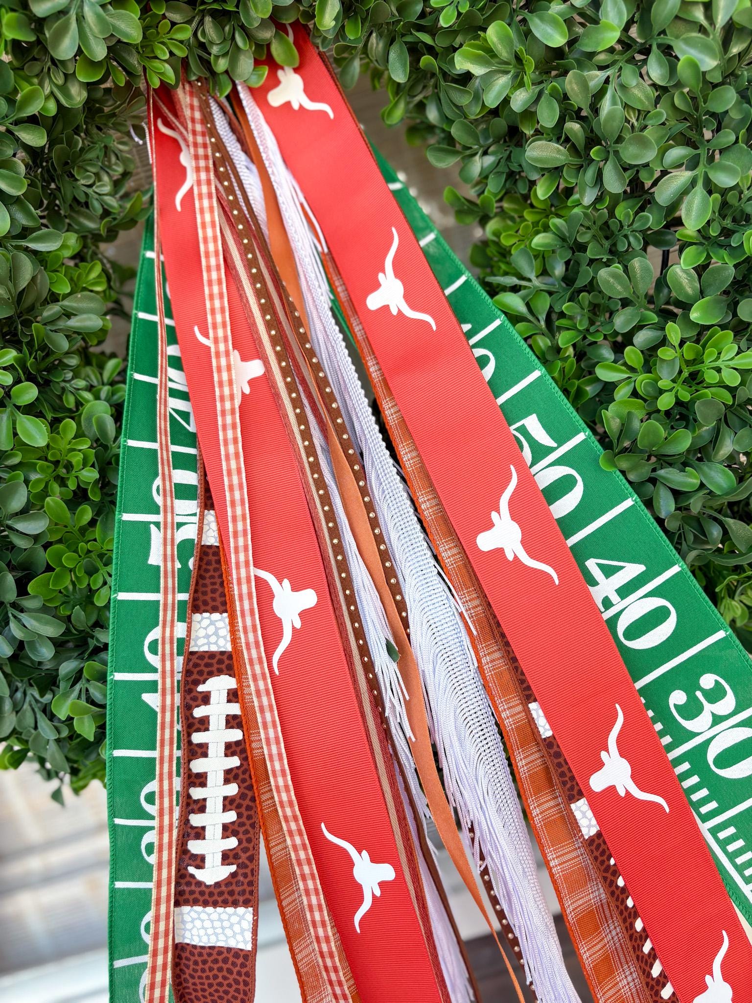 HOOK 'EM HORNS with our custom Texas Longhorns inspired Rally Ribbon bundle, choose from football, basketball, or general school spirit! The perfect addition for adorning your front door, these bundles come with a vibrant assortment of high-quality ribbons in your school's colors and sport designs.