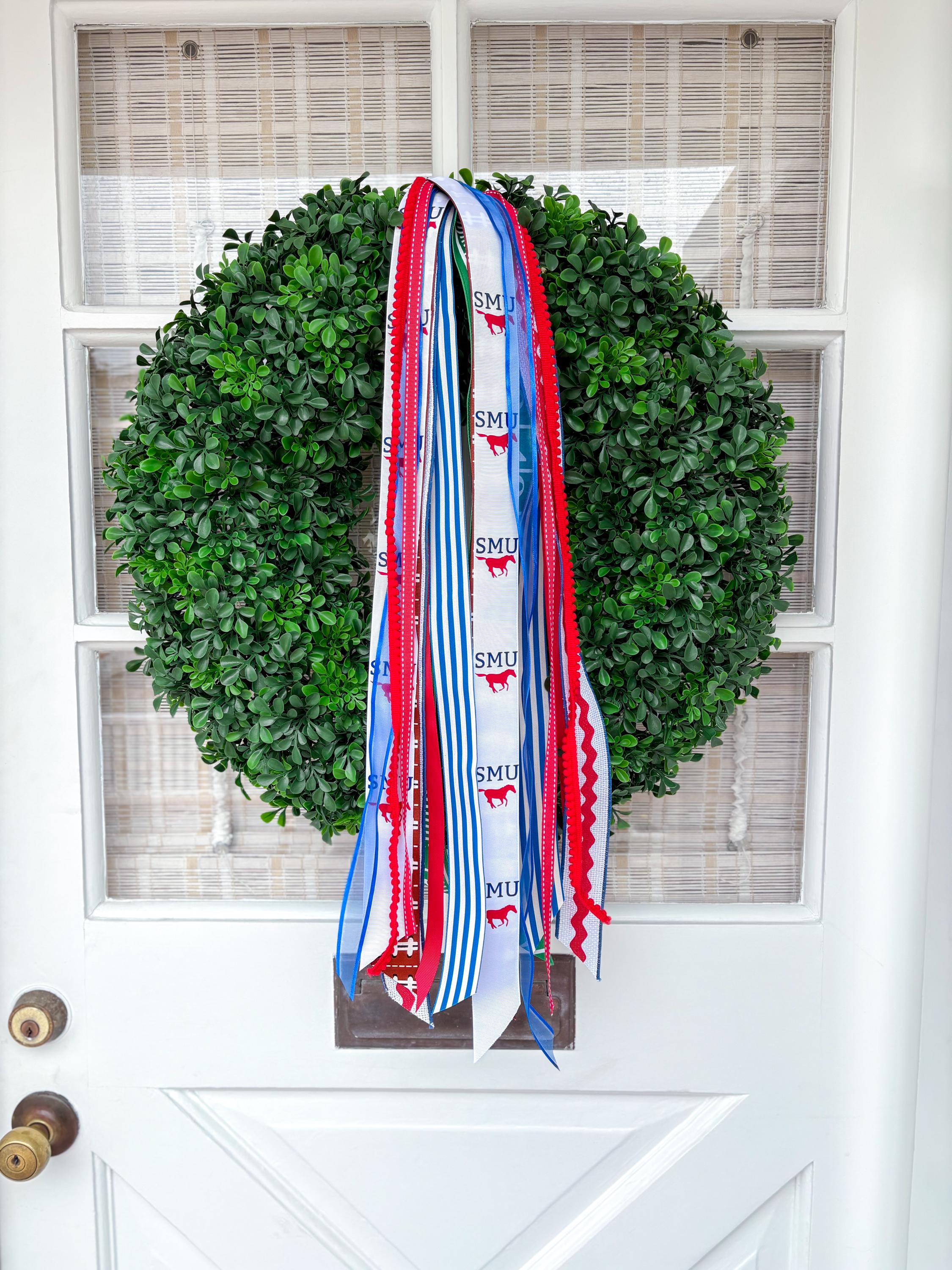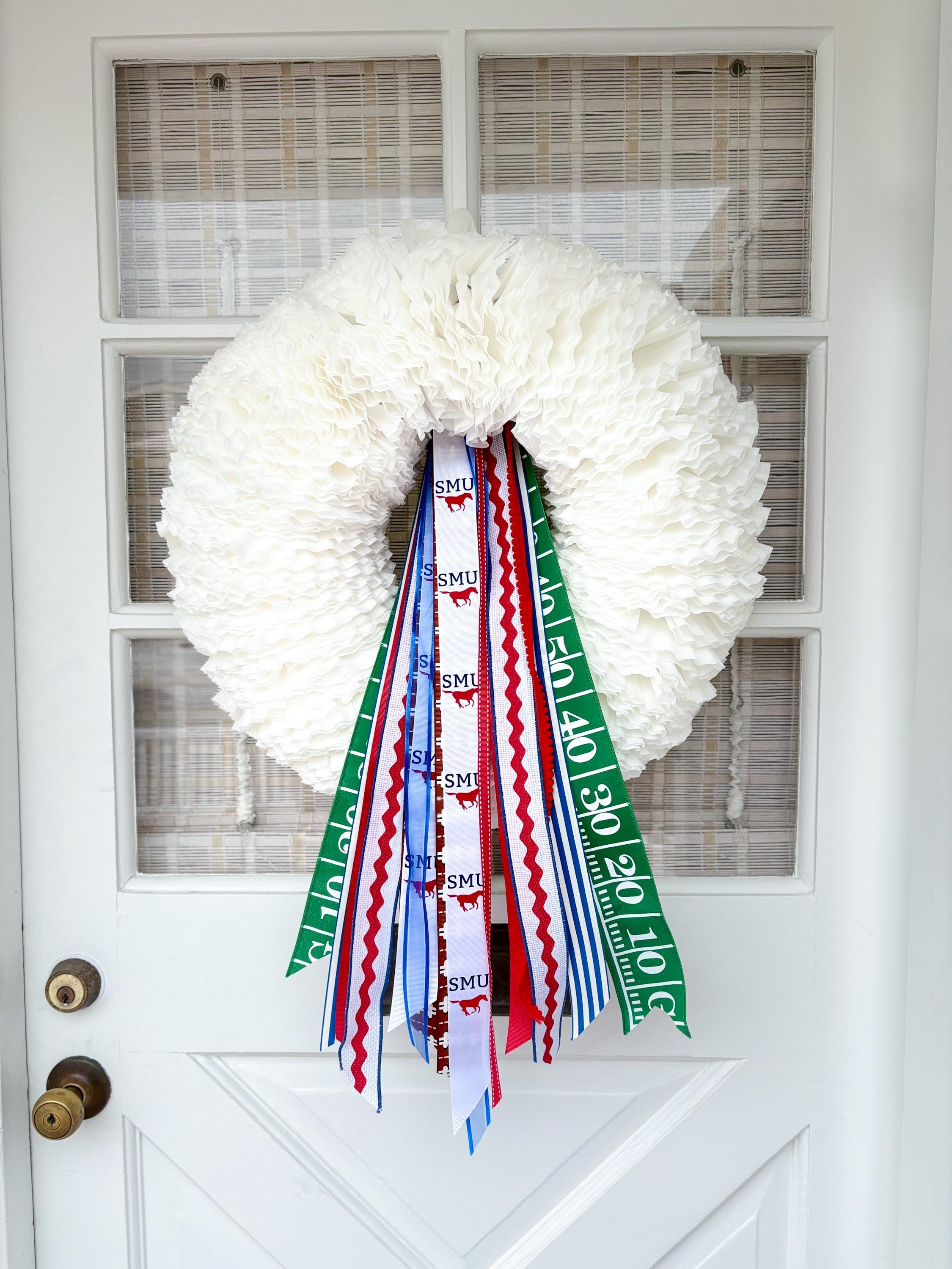 PONY UP! with our custom SMU inspired Rally Ribbon bundle, choose from football, basketball, or general school spirit! The perfect addition for adorning your front door, these bundles come with a vibrant assortment of high-quality ribbons in your school's colors and sport designs.