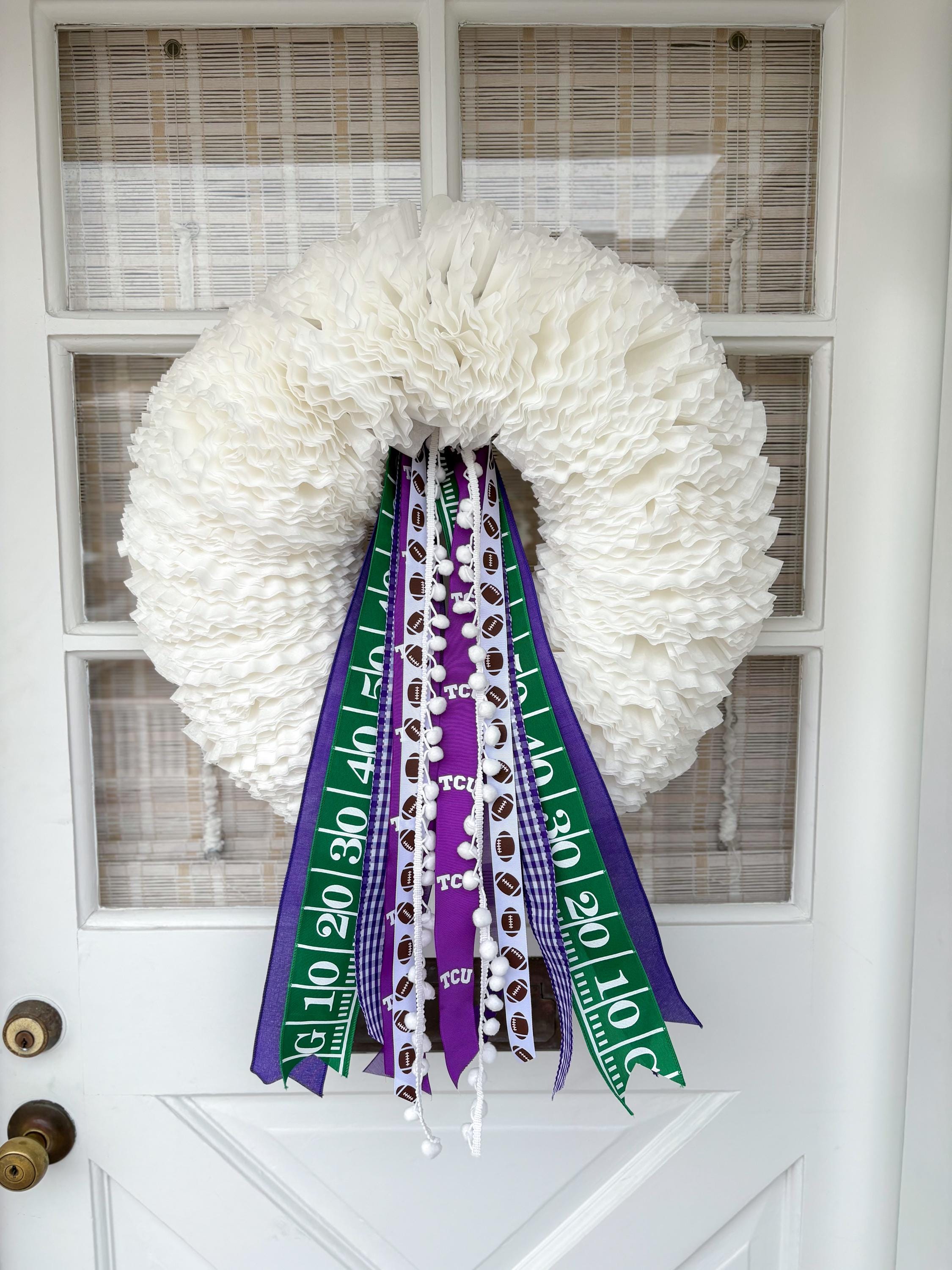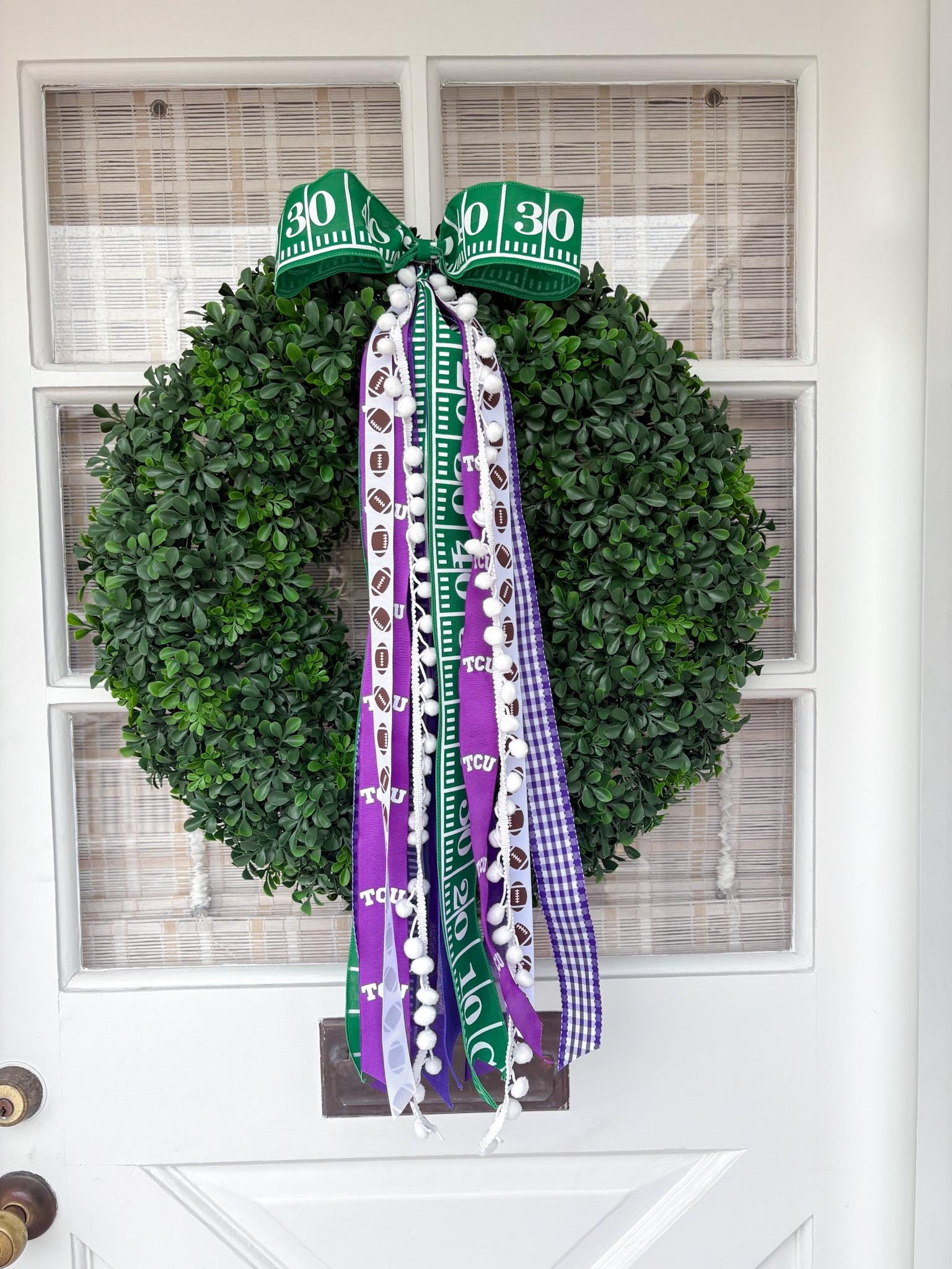 Riff, Ram, Bah, Zoo! with our custom Texas Christian University inspired Rally Ribbon bundle, choose from football, basketball, or general school spirit! The perfect addition for adorning your front door, these bundles come with a vibrant assortment of high-quality ribbons in your school's colors and sport designs.