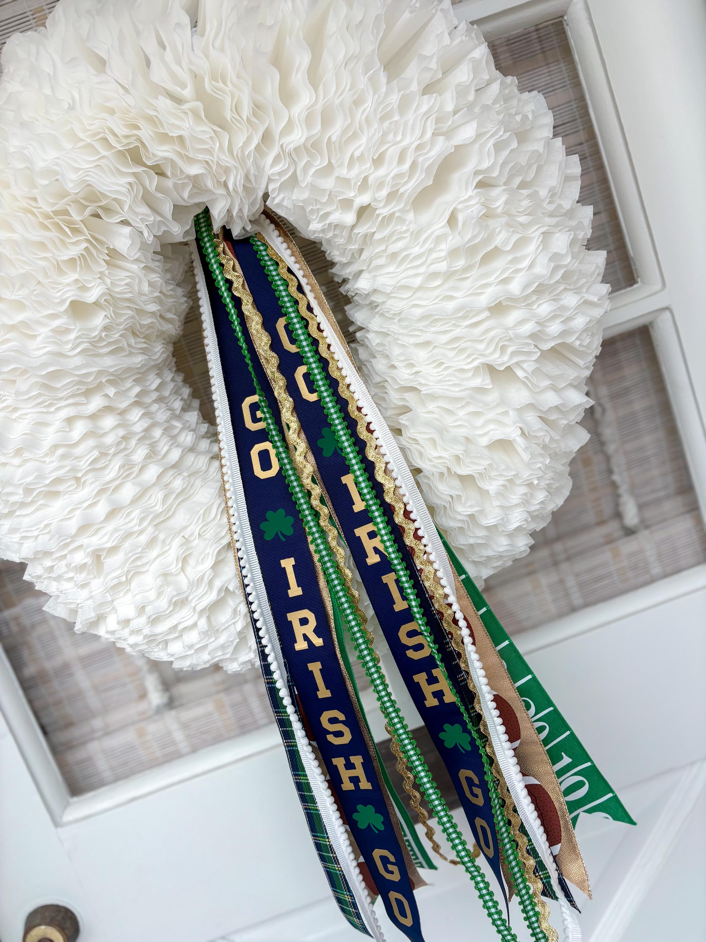 WAKE UP THE ECHOS with our custom FIGHTING IRISH inspired Rally Ribbon bundle, choose from football, basketball, or general school spirit! The perfect addition for adorning your front door, these bundles come with a vibrant assortment of high-quality ribbons in your school's colors and sport designs.