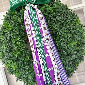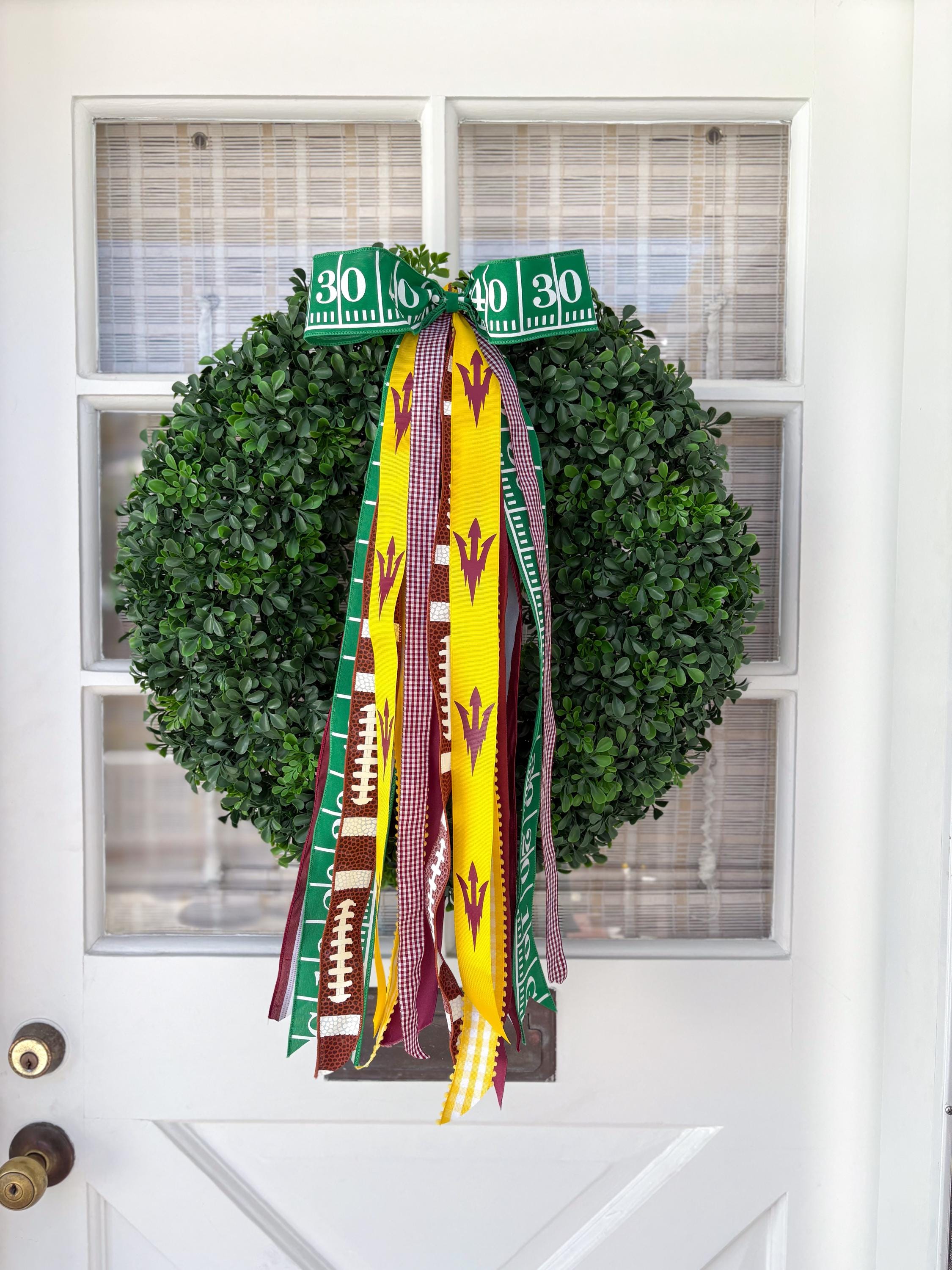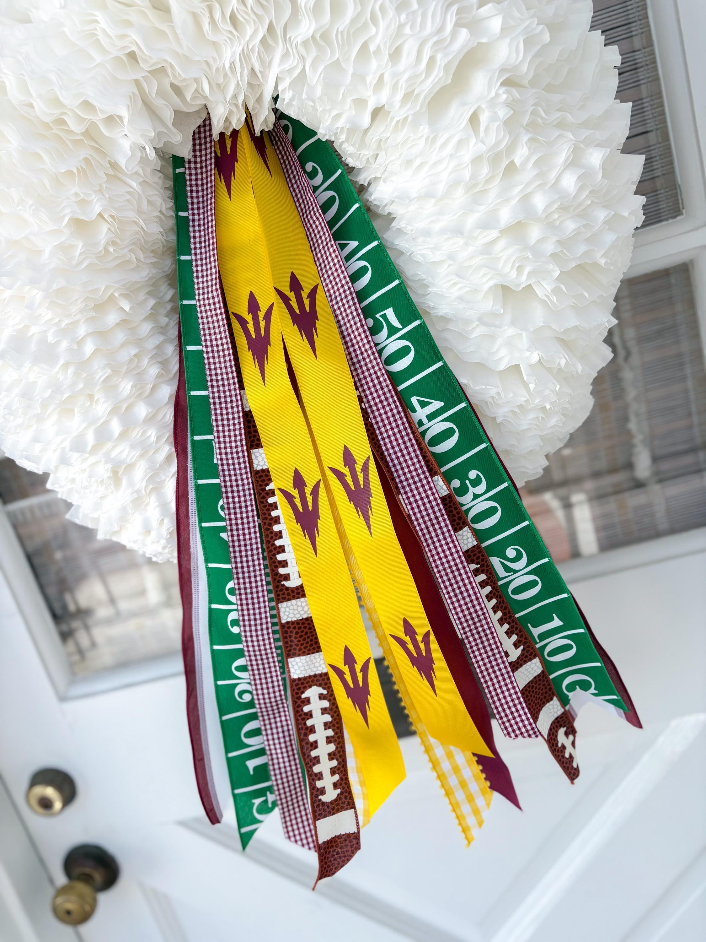 SPORT THE FORK with our custom Arizona State University inspired Rally Ribbon bundle, choose from football, basketball, or general school spirit! The perfect addition for adorning your front door, these bundles come with a vibrant assortment of high-quality ribbons in your school's colors and sport designs.