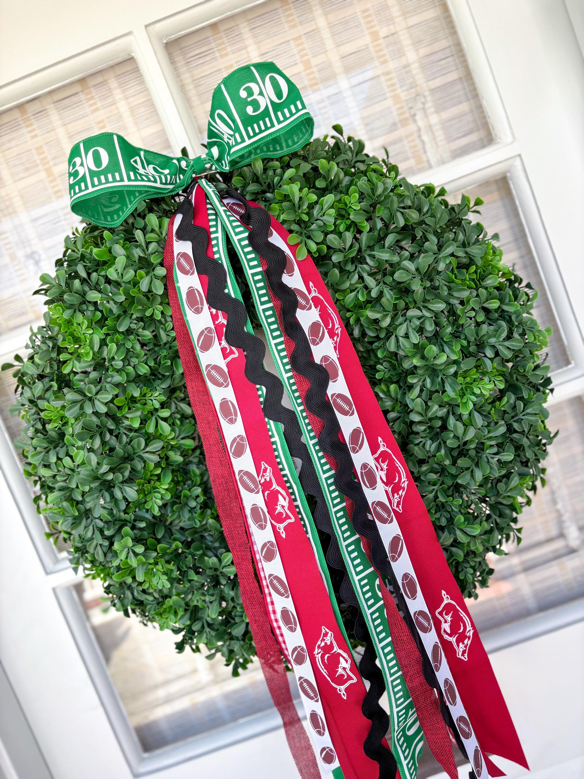 Woooooooo. Pig. Sooie! with our custom Razorbacks inspired Rally Ribbon bundle, choose from football, basketball, or general school spirit! The perfect addition for adorning your front door, these bundles come with a vibrant assortment of high-quality ribbons in your school's colors and sport designs.